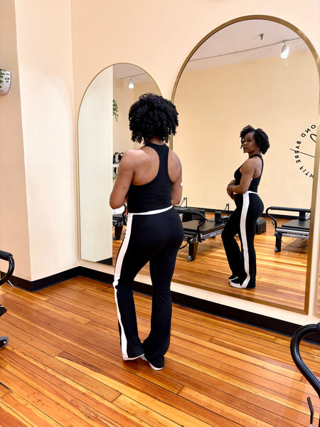 High waist, flared leggings in black with a bold side contrasting stripe going down both sides of the pants in white.