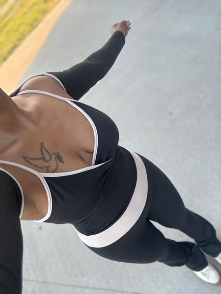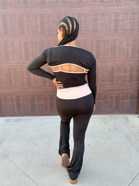 A 3 piece Long Sleeve Shrug & Legging Set in Black & Taupe