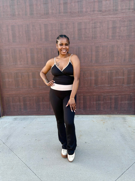 The Color block Leggings have a bootcut hem, the waistband is a taupe color with side ruching. (Inseam, approx. 35 inseam)