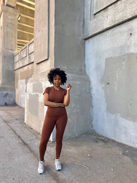A high crewneck short sleeve top with high waist matching leggings in a coffee brown color.