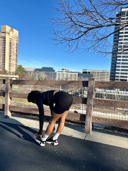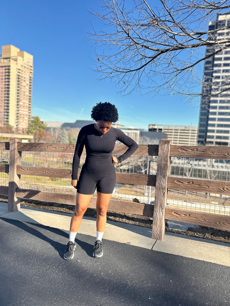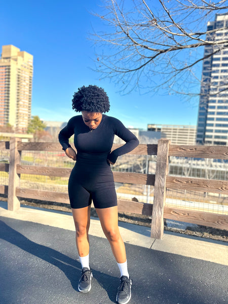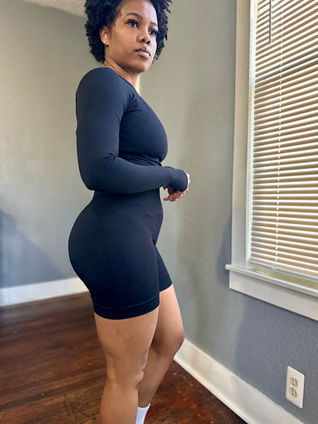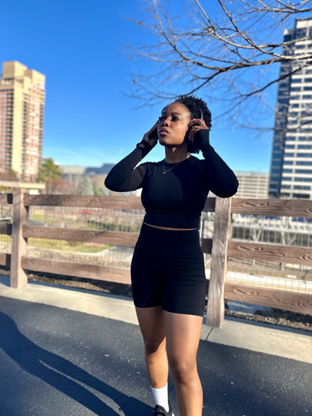 The crop top has thumb holes and the biker shorts are high waist. There are subtle lines all throughout both the top and shorts.